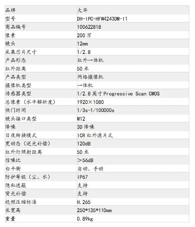大华 DH-IPC-HFW4243DM-I1 200万12mm星光红外网络摄像机