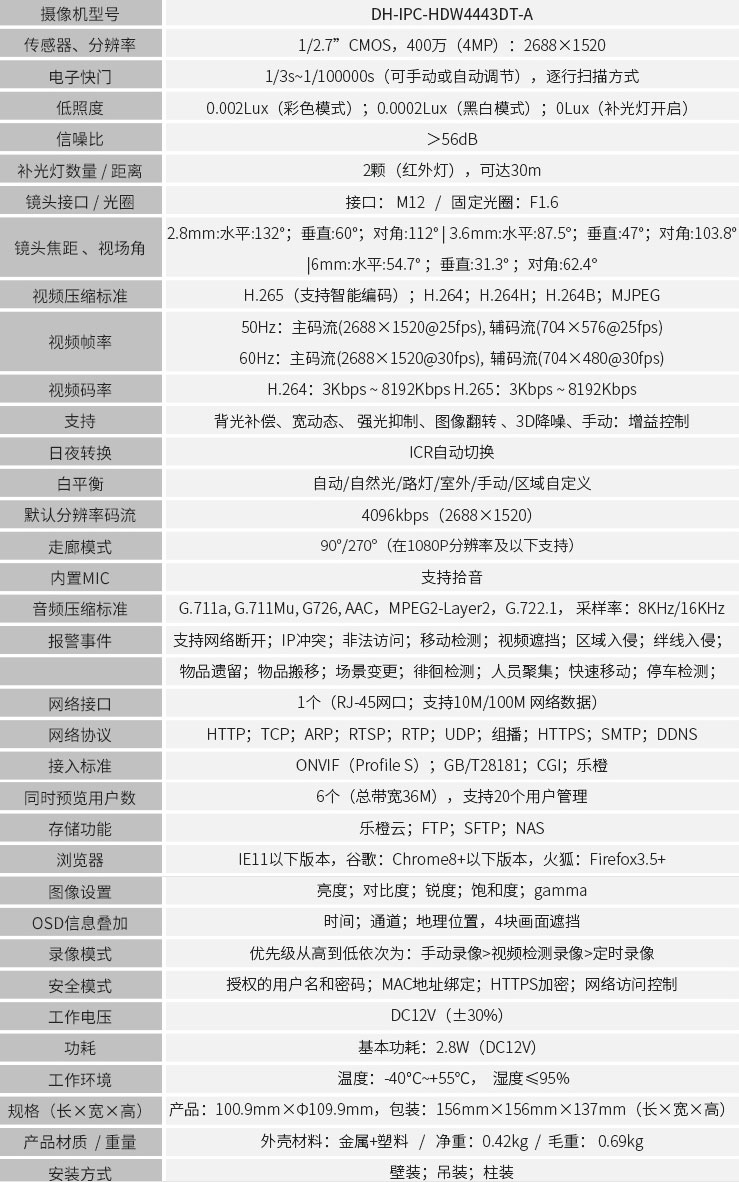 大华摄像头 400万星光级网络摄像机 高清夜视 内置麦克风 H.265编码 DH-IPC-HDW4443DT-A 人车检测网络摄像机